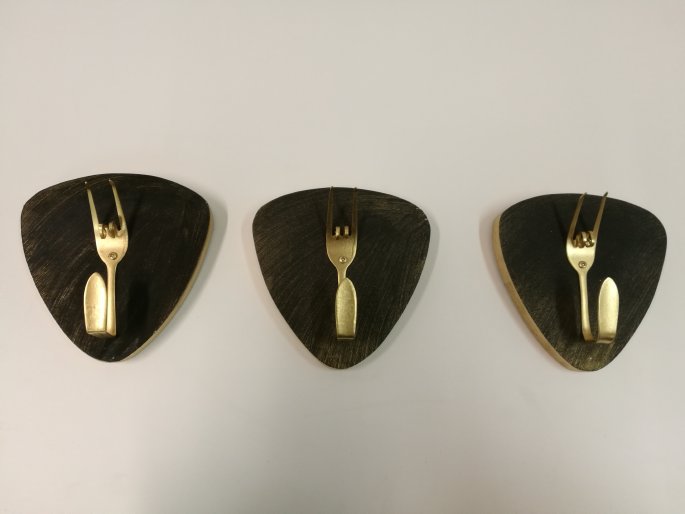 Materials: repurposed cutlery mounted on 18mm birch ply with gold lacquer finish.